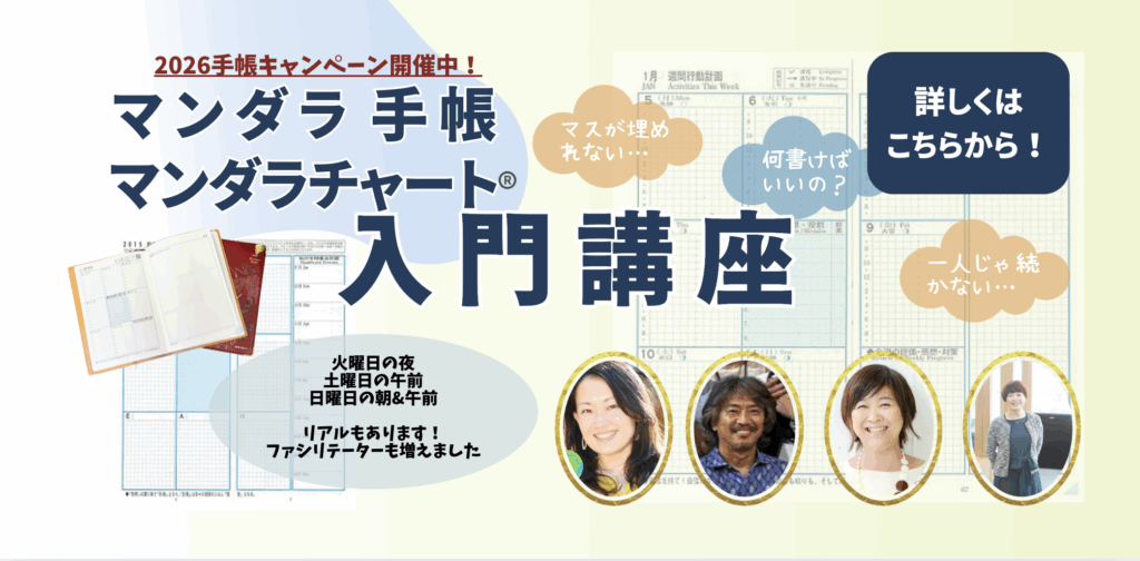 はじめてマンダラチャートを学びたい! マンダラチャートをやってみたい! マンダラ手帳を使ってみたい! という人に最適の入門講座とワークショップです♪ 自己流のマンダラチャートでよく発生するつまづき 本来のマンダラチャー […]