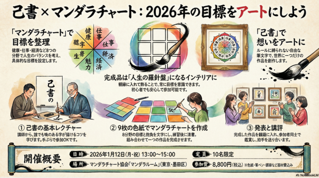 目標達成ツールとして名高い「マンダラチャート」と、心のままに筆を走らせる筆文字アート「己書(おのれしょ)」がコラボレーション。頭の中にある想いを整理し、味のある筆文字で可視化することで、目標達成へのエネルギーを高める特別なワークショップを開催します。