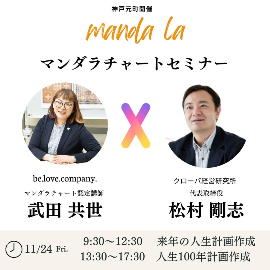 朝は私、マンダラチャート認定講師のやんこが、マンダラチャートA型を使用して来年度の計画を立てるワークショップを、午後には、クローバ経営研究所の松村剛志社長をゲストに迎え、マンダラチャートB型を使用して100年計画の作成をサポートします。