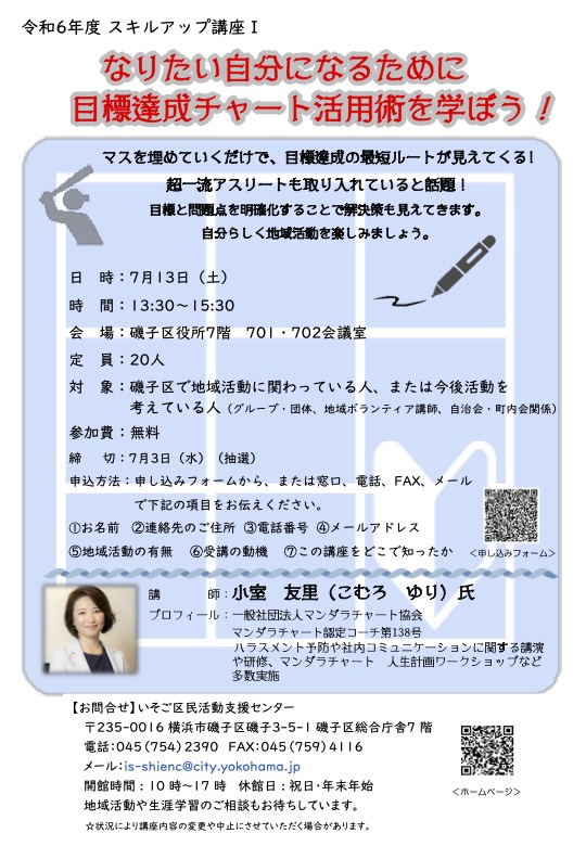 2024年8月13日土曜日、いそご区民センターにて「令和6年度スキルアップ講座1 なりたい自分になるために目標設定チャート活用術を学ぼう!」ワークショップを開催いたしました。40名近いの皆様にご参加いただきました。