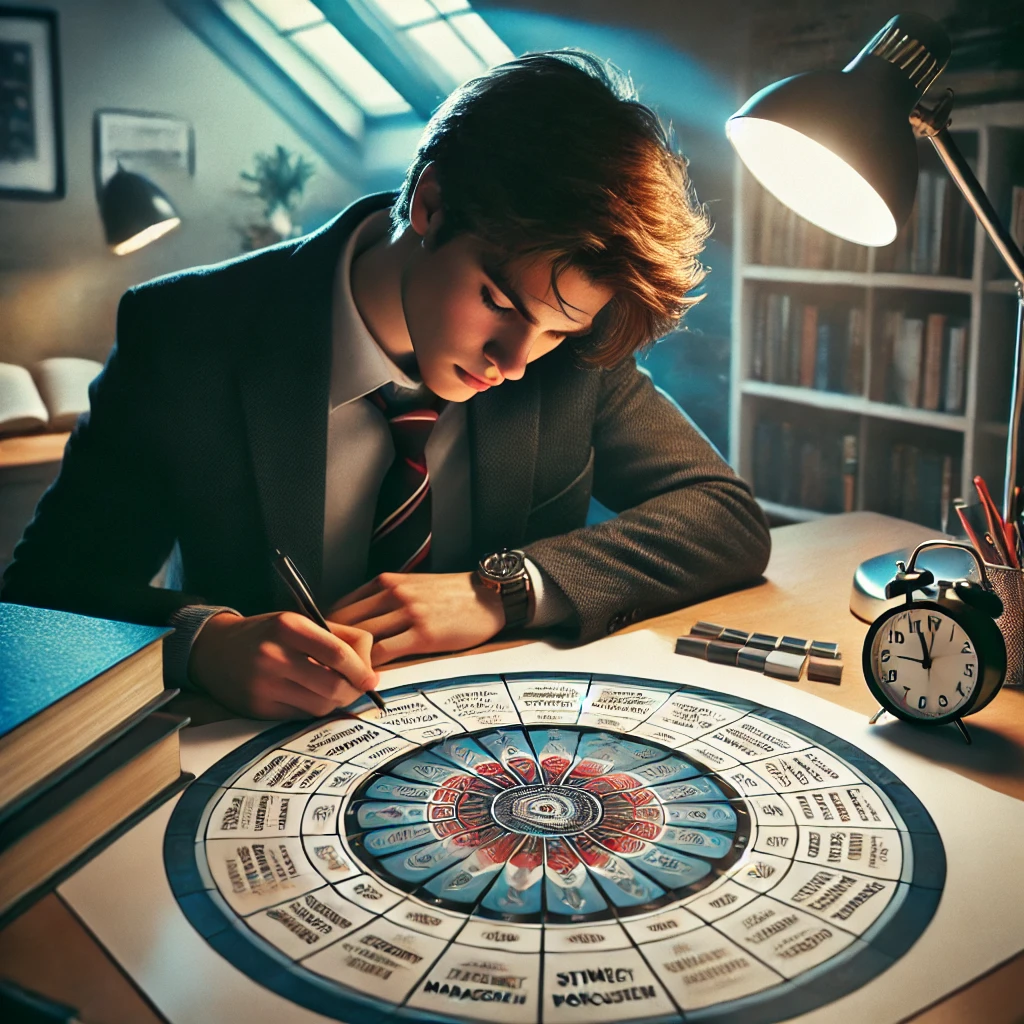 ある高校2年生の生徒は、大学受験という大きな目標に向けてマンダラチャートを活用しました。彼は中心に「第一志望校に合格する」という目標を設定し、周りに「勉強時間の確保」「苦手科目の克服」「模試対策」「体調管理」など、具体的な行動や方針を細かく書き出していきました。