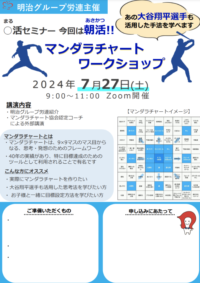 2024年7月27日、明治グループ労連主催の朝活セミナーとして、一般社団法人マンダラチャート協会が「マンダラチャートワークショップ」をZOOMで開催しました。全国から40名の社員様にご参加いただきました。