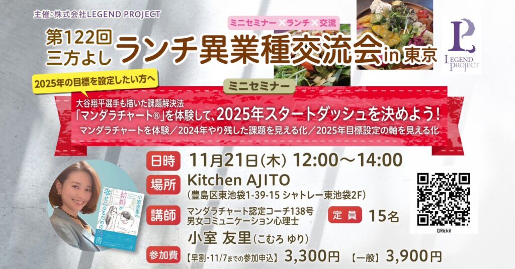 そんな「マンダラチャート」を体験できるイベントが、11月21日に東京・池袋で開催される「三方よしランチ異業種交流会」です。この交流会では、異業種の方々と気軽にランチを楽しみながら、新たな知識や人脈を得ることができます。