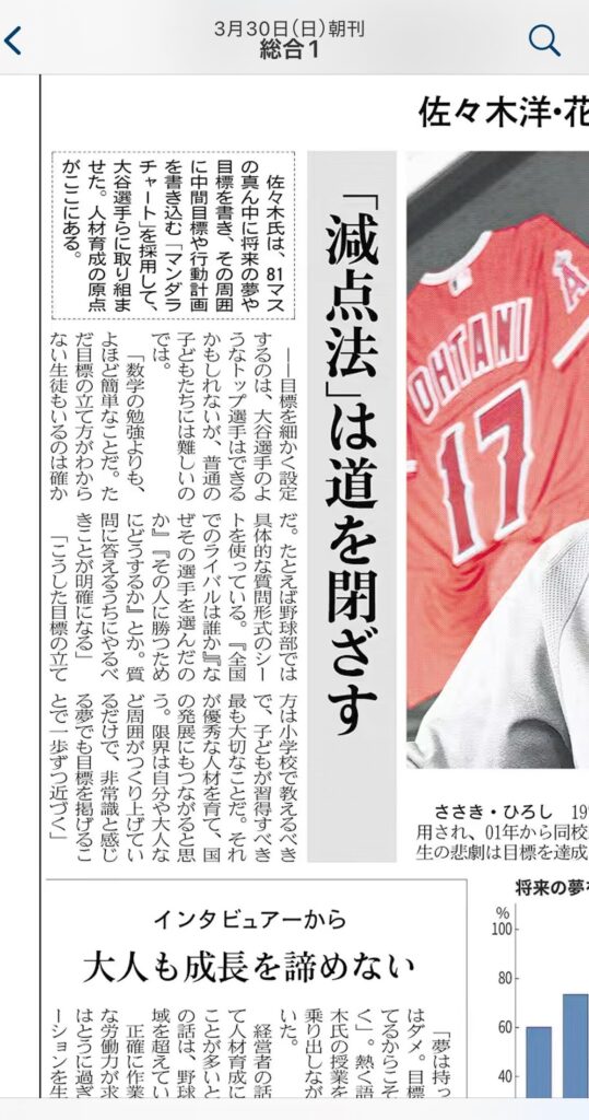 ✅ 3月30日の日経新聞にて、花巻東高校・佐々木監督がマンダラチャートでの目標の立て方を紹介