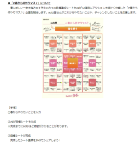 KDDI株式会社の学生応援プロジェクト 当協会は、KDDI株式会社が開始した「さぁ、何やる?青春」プロジェクトを監修いたしました。卒業・進級を迎える学生を応援するこのプロジェクトでは、マンダラチャートを活用した目標達成シ […]