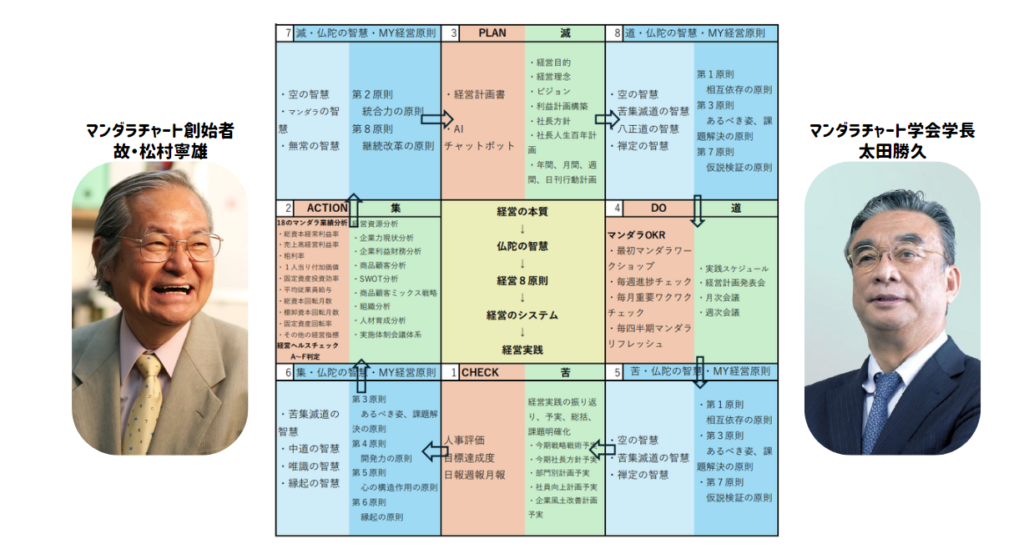 マンダラチャートの開発創始者・松村寧雄先生が考案し、マンダラチャート学会学長・太田勝久先生がまとめ上げた経営計画メソッド。