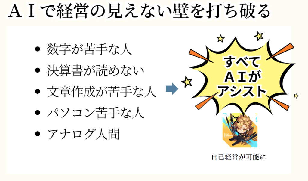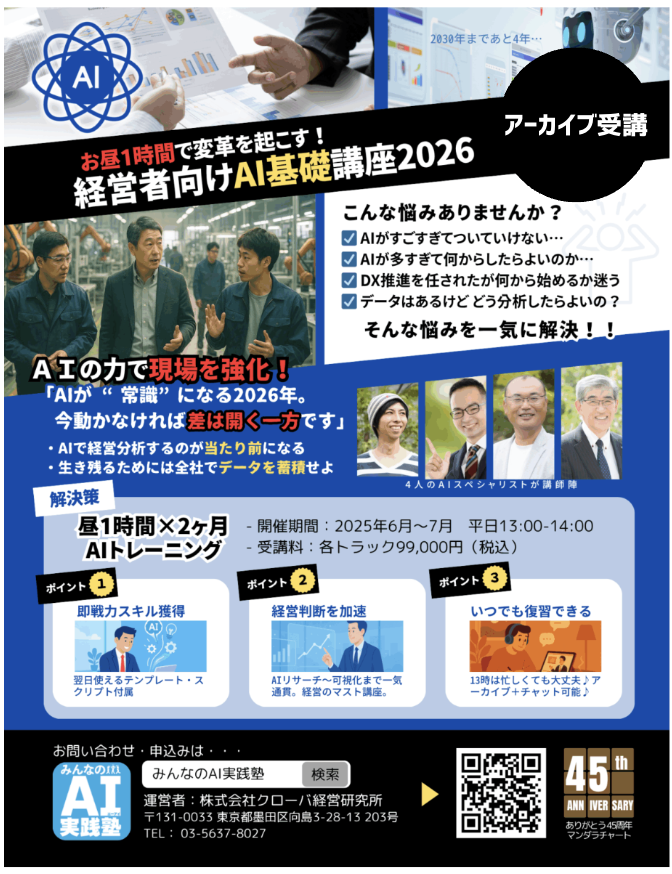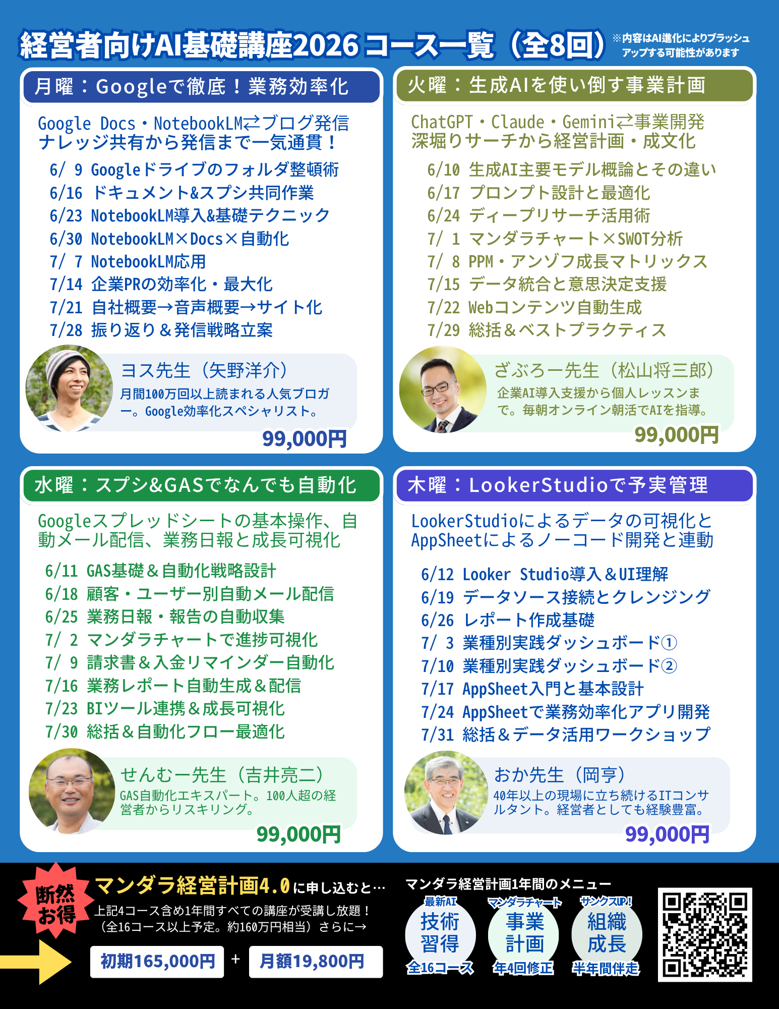 マンダラ経営計画受講者でサブスクをお支払いている方は、これから経営者にとって必要なAIの知識を身につける「経営者向けAI基礎講座」をすべて受講することが可能です。月曜から木曜13時-14時の講座でアーカイブ学習も可能です。さらに、みんなのAI実践塾で、AIを実践する仲間たちとともに、毎日の朝活やGoogle スプレッドシートによるデータ蓄積や分析など、実践的なノウハウを学び続けることが可能です。この機会にぜひ入塾してください。