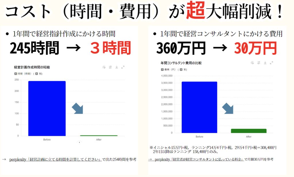 これにより、従来の経営計画作成の時間が大幅に短縮され、コストも削減されます。